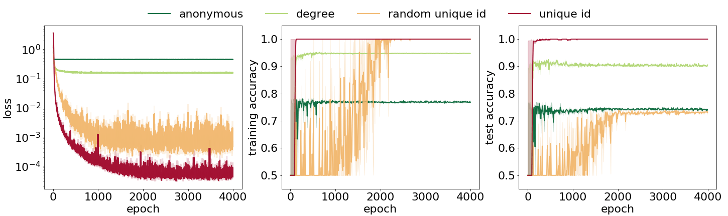 As seen, more discriminative node attributes yield significantly better performance. When the nodes were given non- or partially-discriminative attributes, the network could not detect cycles—even in the training set. The cycle detection problem was solved exactly when nodes were given unique attributes. Though, when there was no consistent way of assigning ids across graphs, the network could not learn to generalize.
