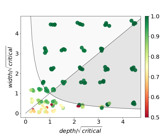 Figure 4 examines further the relationship between depth, width, and test accuracy. This time networks are separated depending on their depth and width normalized by the square root of the critical capacity. For each , the critical capacity is the minimum