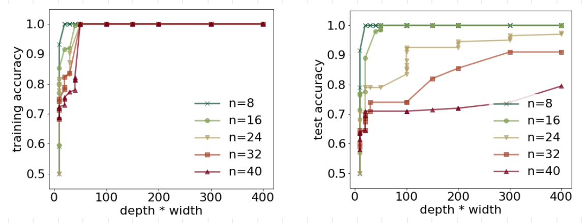 Figure 3 depicts the accuracy of the best performing networks. As seen, even small neural networks could consistently classify all test examples perfectly when . Moreover, there is a strong correlation between test accuracy,